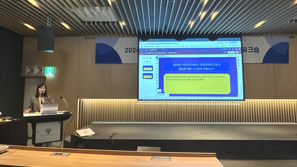 키워드로 보는 2024년 사회복지기관평가, 사회복지서비스 품질관리 사업, 발전방안이란 주제로 분임토의가 진행되었습니다. 금번 역량강화 워크숍은 워크숍 시작 전 사전설문을 바탕으로 분임토의에 활용할 주요 주제(5개)를 도출하였고, 현장에서 온라인 협업툴(알로)을 활용하여 참여자들의 참여와 의견 공유를 촉진하는 방식으로 분임토의를 진행하였습니다.