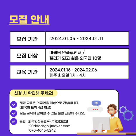 2024년 1월, 다다르고가 셀러나 인플루언서를 희망하는 국내거주 외국인을 대상으로 마케팅 부트캠프를 진행한다고 하여, 디지털 마케팅 교육을 여러번 했던 삼돌텍이 마케팅 이론 교육과 상품상세페이지 제작 실습 워크숍을 맡았습니다. 재단법인 밴드과 한국수자원공사의 후원으로 진행된 본 교육에는 대만, 미얀마, 베트남, 사우디아라비아, 중국에서 온 외국인 유학생들이 참여해주셨습니다.